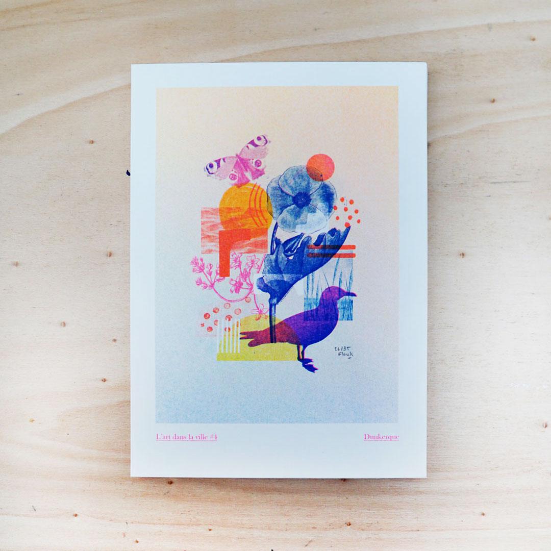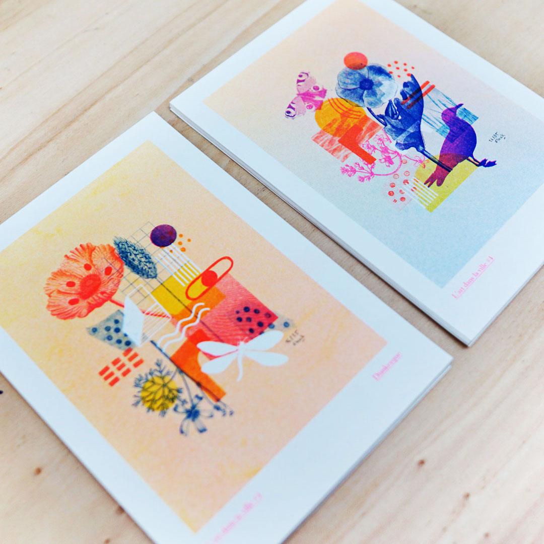Risographie 3 couleurs imprimée (bleu, rose, jaune) sur papier 200g